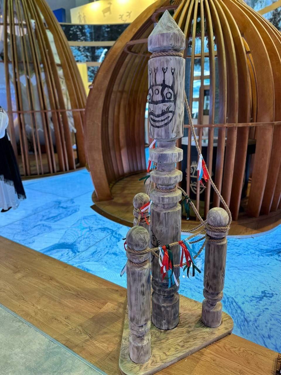 «Вместо менгира на переднем плане стенда установлен сарчын - специальная священная коновязь, на которую посетители, загадывая желания, смогут повязывать цветные ленты чалама. Зимний видеоконтент на радиусных экранах и светодиодный пол стенда, на котором можно оставить следы на заснеженной земле. Кроме того, они помогают посетителям погрузиться в незабываемые красоты нашей республики» - сообщает Министерство экономического развития Хакасии.