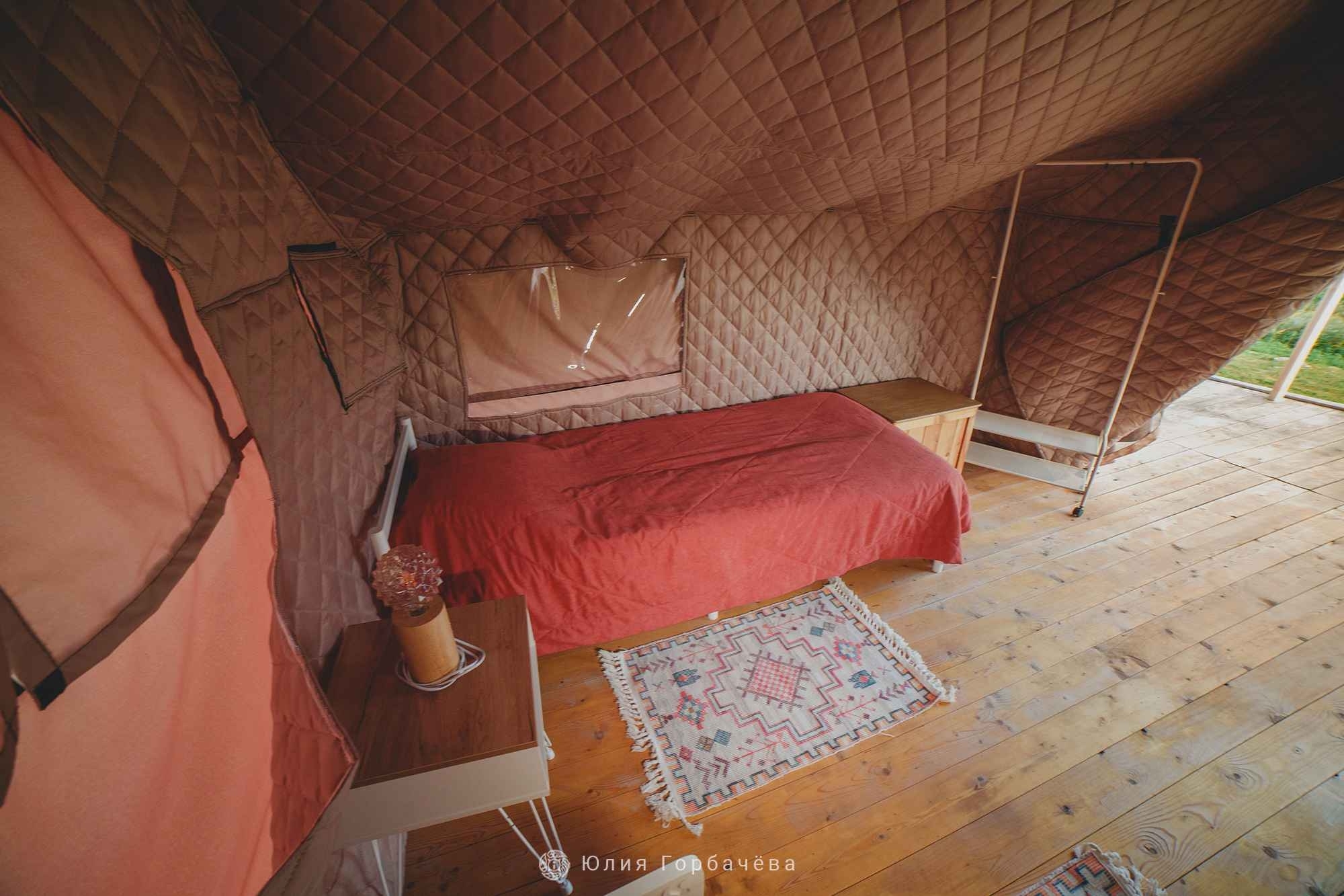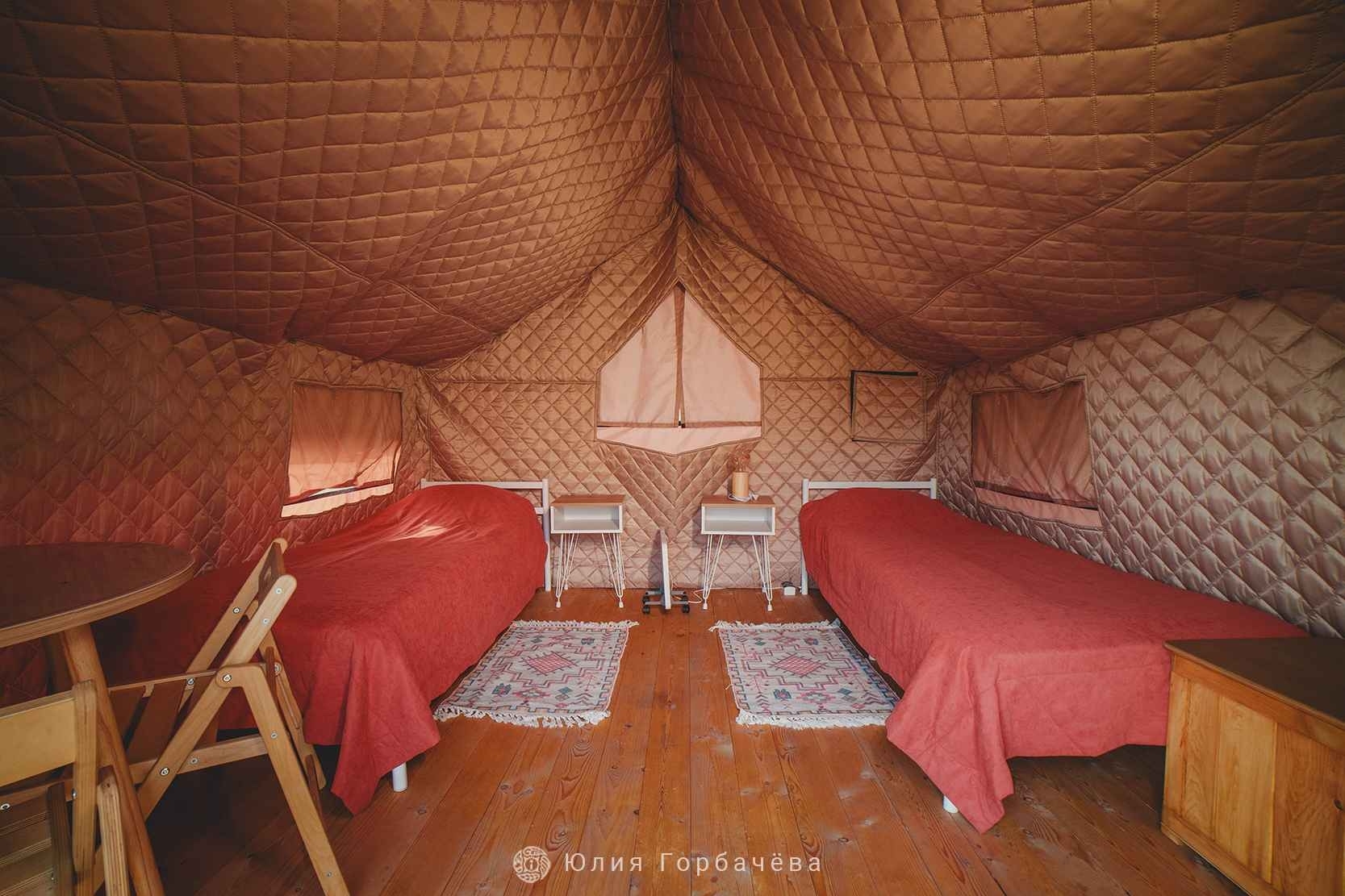 Глэмпинг — это идеальное сочетание удобства и близости к природе. Мы предлагаем уютный домик для двух человек, где каждый элемент продуман для вашего комфорта. Внутри глэмпинга: две односпальные кровати с одеялами, подушками и постельным бельем, покрывала, полотенца (по два на человека), тумбочки с прикроватными светильниками, напольная вешалка, обеденный стол, посуда, обогреватель, раскладные стол и стулья, деревянный шезлонг, сундук для хранения вещей. По запросу вам бесплатно предоставят: дополнительную посуду, настольные игры. Возможно проведение индивидуальной экскурсии по экспозиции визит-центра (по предварительной записи).