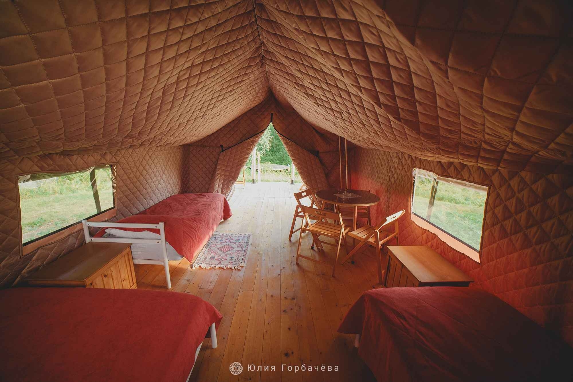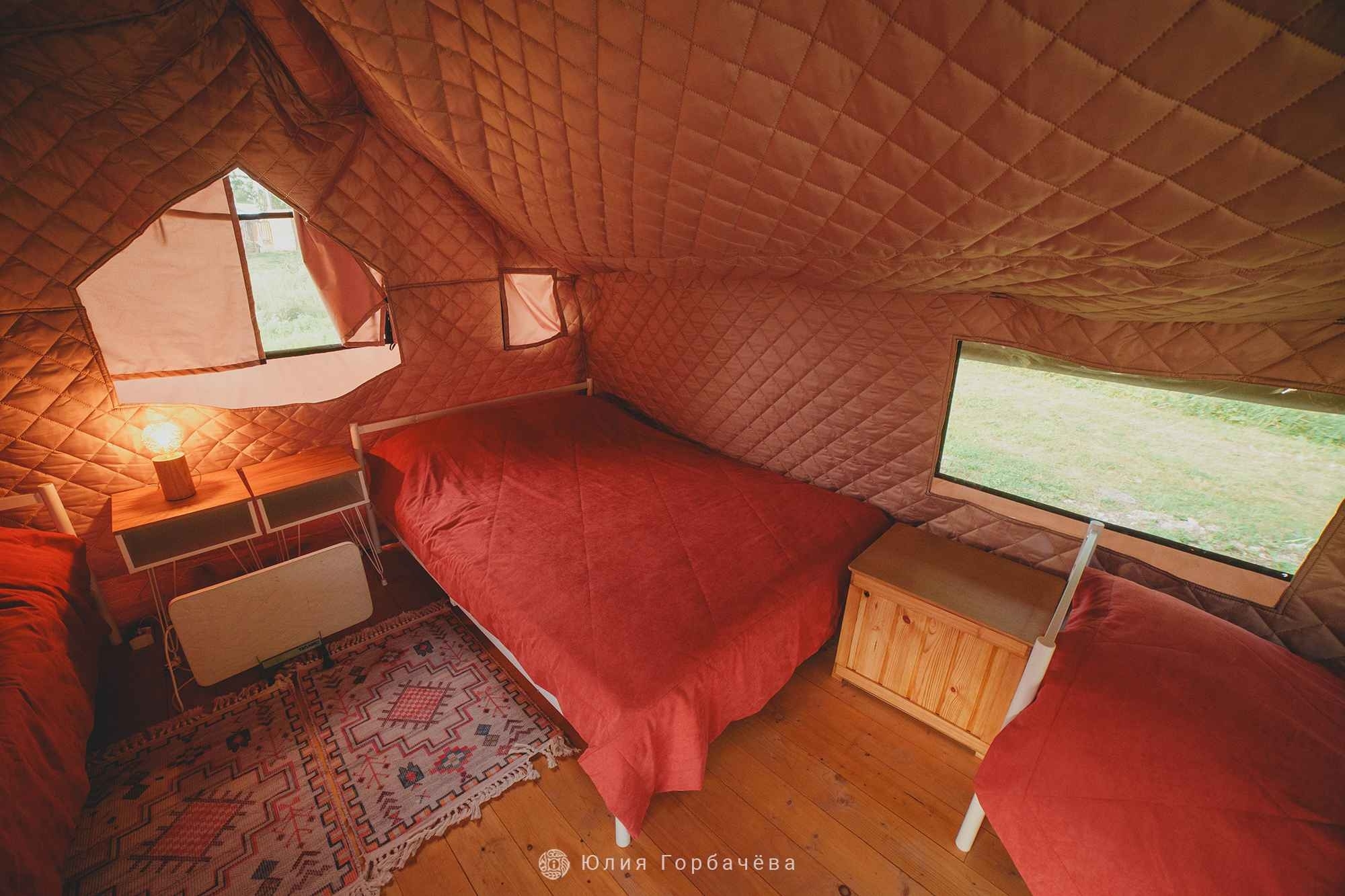 Глэмпинг — это идеальное сочетание удобства и близости к природе. Мы предлагаем уютный домик для семьи, где каждый элемент продуман для вашего комфорта. Внутри глэмпинга: одна двуспальная и две односпальные кровати с одеялами, подушками и постельным бельем, покрывала, полотенца (по два на человека), тумбочки, прикроватный светильник, напольная вешалка, обеденный стол, посуда, обогреватель, раскладные стол и стулья, деревянный шезлонг, два сундука для хранения вещей. По запросу вам бесплатно предоставят: дополнительную посуду, настольные игры. Возможно проведение индивидуальной экскурсии по экспозиции визит-центра (по предварительной записи).